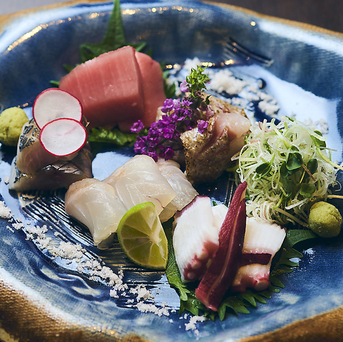 季節の鮮魚を使った刺身盛り合わせ。魚の種類ごとに丁寧な仕事をしています。3種盛りや、単品でもご注文いただけます!