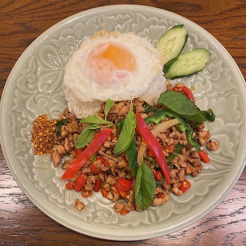 エスニックブームの火付け役のガパオももちろんお召し上がりいただけます◎「ガパオ」の意味は、バジルの一種であるホーリーバジルのタイ語。メインとなる肉類、または魚介類とたっぷりのガパオ、唐辛子、にんにくを豪快にシンプルに炒めた、屋台料理です!さわやかな辛みがたまりません!