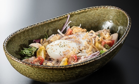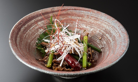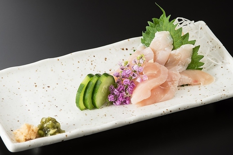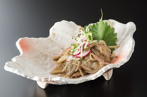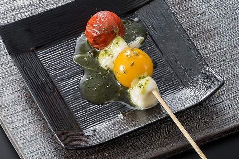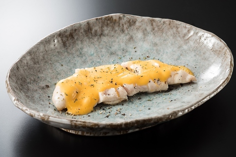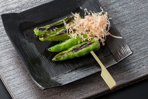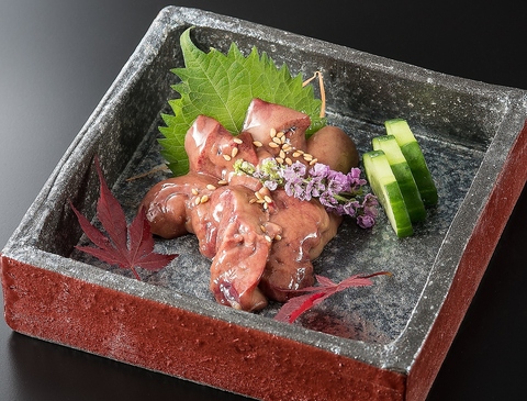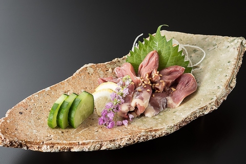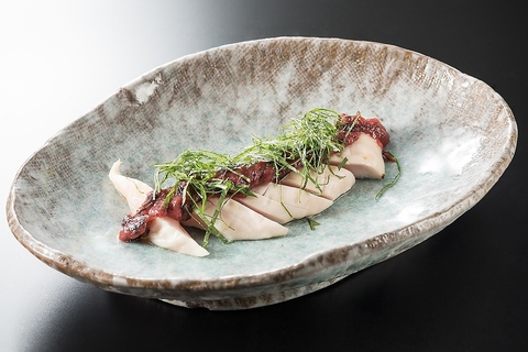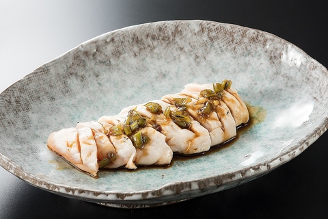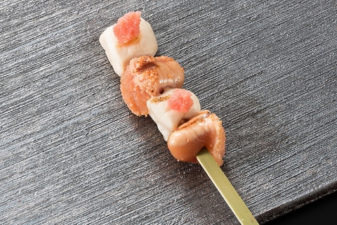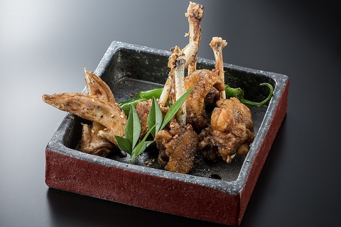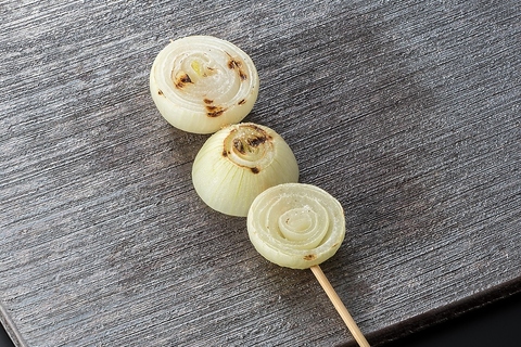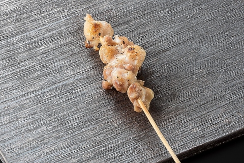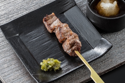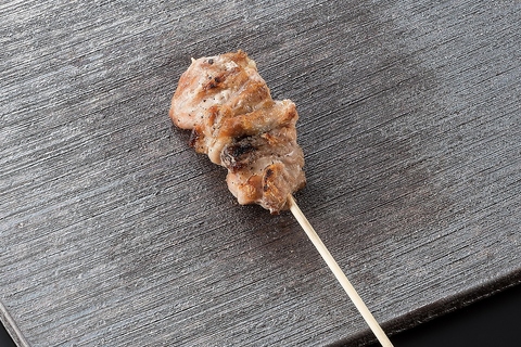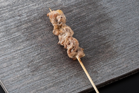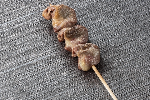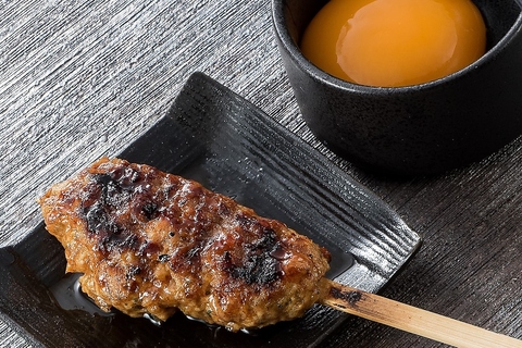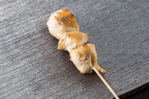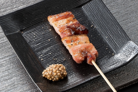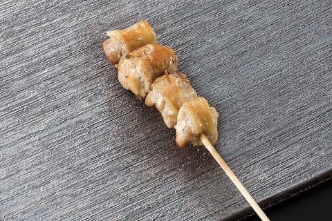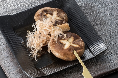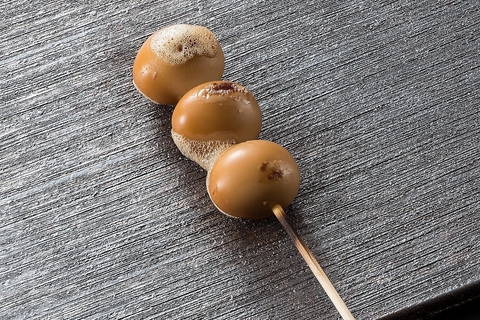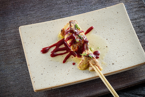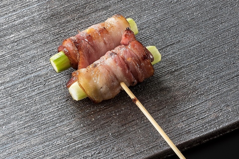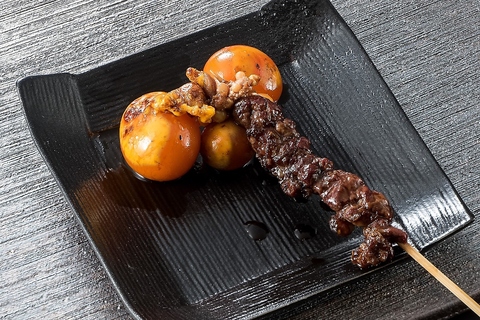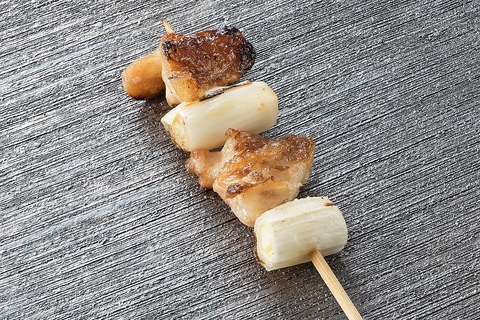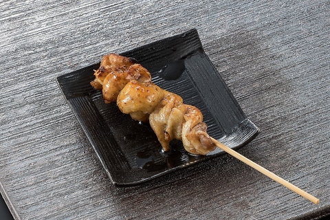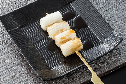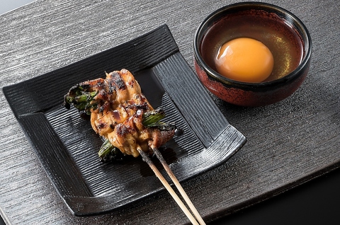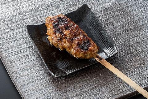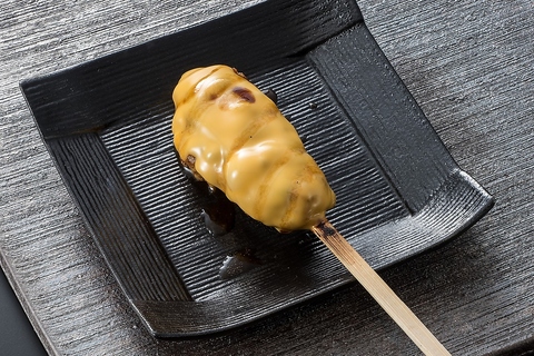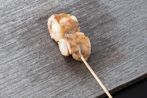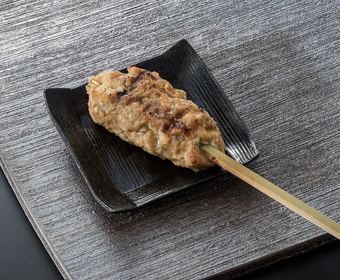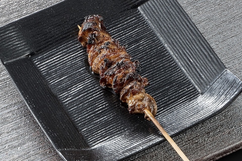 鶏モモ肉に春菊を巻いて、もち麩を挟んですき焼きのタレで焼く当店オリジナルメニュー!