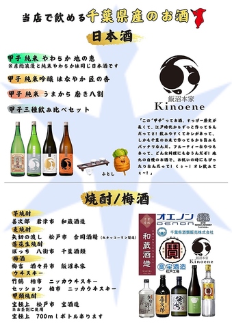 | ◆松コース | 甲子 やわらか/甲子 はなやか/甲子 うまから/芋 黒霧島/芋 善次郎/芋 イサイナ/麦 矢切の渡し/落花生 ぼっち/日本酒梅酒 梅吉/生梅干しサワー/生トマトしそサワー/生ロリコンサワー/生レモンサワー |