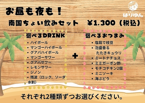 ドリンク2種+南国おつまみ2種がついたプラン♪ご予約不要で承ります!!