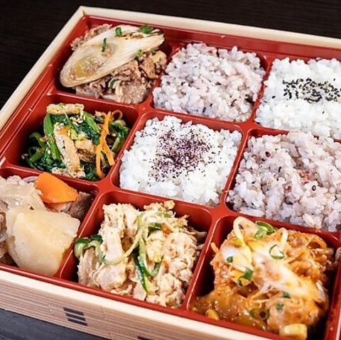 テイクアウトにおばん菜五種のお弁当をご用意しております。当店自慢のメニューをご自宅でもお楽しみください。※写真は一例です。