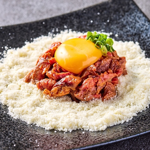 低温調理で仕上げた柔らか牛ハラミをたっぷりのチーズでユッケ仕立てにしました!