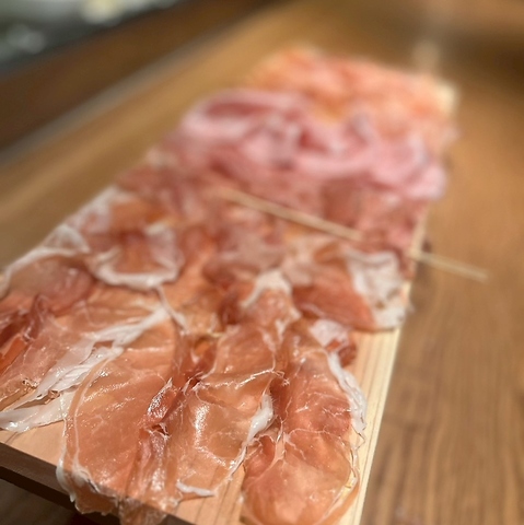 goodspoonおすすめの4種生ハム盛り合わせ!お店に来たらまずはコレ!!イタリア製の最高峰スライサーで注文が入ってから1枚1枚丁寧にお切りしてます