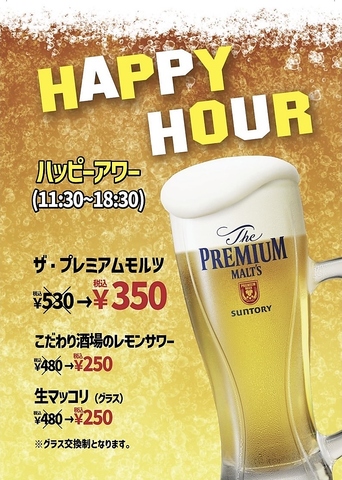 11:30~18:30はハッピーアワー♪ザ・プレミアムモルツやこだわり酒場のレモンサワー等をお得に◎