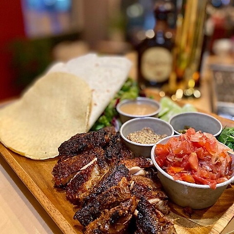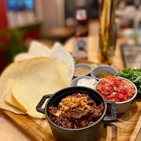 粗挽き肉をギュッと押し潰して焼き上げる「スマッシュビーフ」の香ばしさとジューシーさが堪らない逸品。トッピングも豊富で、レッドサルサやハラペーニョ、アボカド など、自分好みのタコスを完成させてください!自家製トルティーヤも別注文で追加可能です。