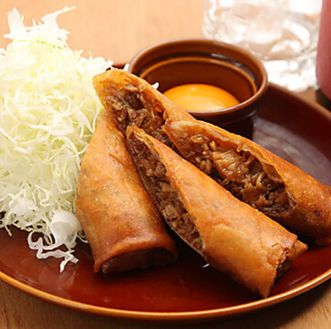 数ある創作料理の中で特に人気なのは、中身にすき焼きが入った「すき焼き春巻き」。卵黄を付けていただく新しい味わいが堪りません!麺は製麺所から、バンズは専門店から仕入れるなど、基本手作りでありながら、当店の味に合うよう厳選した素材も使用しています。