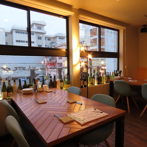 光が差し込むリラックスした雰囲気の店内。4名掛けのテーブル席は、女子会など様々なシーンにご利用ください!