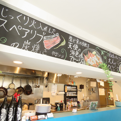 店内を覗くと広がる鮮やかな“青色”のカウンター席。当店では、内装や食器などに青色に使用し、色味にこだわった『青』に囲まれながらお食事をお楽しみいただけます。シンプルな色味でまとまった店内は、スタイリッシュで落ち着いた雰囲気ながら、とても親しみやすい色合いでごゆっくりとお寛ぎいただけます。SNS映えもばっちりです◎