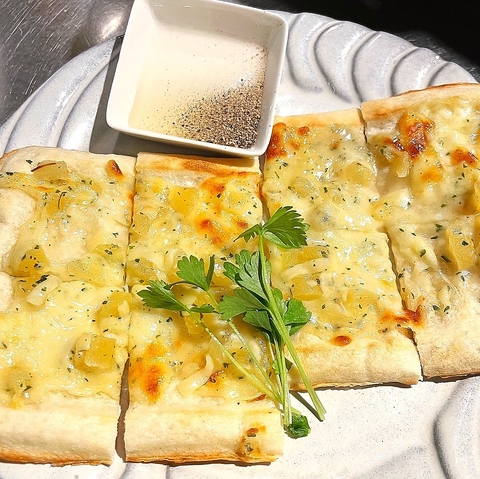 クリーミーなゴルゴンゾーラチーズの濃厚な味わいと、フレッシュなりんごの爽やかな甘みが絶妙にマッチ。薄くパリッとしたローマ風生地が素材の風味を引き立て、一口ごとに豊かな味わいが広がります。ワインとの相性も抜群で、大人の贅沢な一品です。