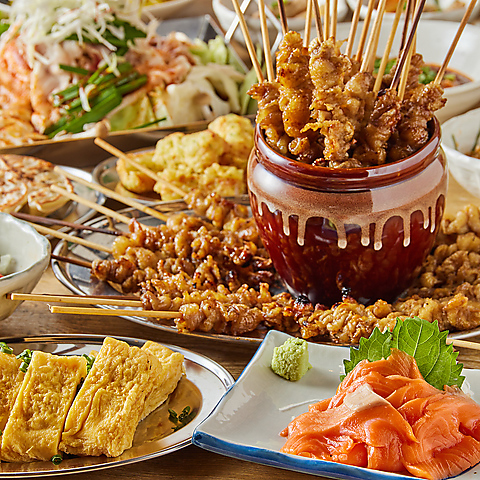 名物『焼き鳥』『銘柄手羽先』『厳選和食』に加えて、国産和牛もつ鍋まで食べ放題!さらに飲み放題付きで、コスパ抜群の豪華宴会コースをご用意しました!旨味が詰まった炭火焼き鳥、味付け豊かな手羽先、旨味が詰まった大山地鶏の唐揚げ、サクサクの串カツ、そしてコク深いもつの旨味がしみ渡る本格もつ鍋まで!宴会・飲み会・女子会・会社の集まりなどにもぴったりです!