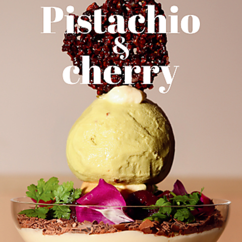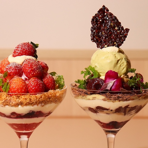 芳醇な香りのピスタチオに酸味のあるダークチェリーとチョコレートを合わせて。少し大人な奥深い味わいのパフェ。