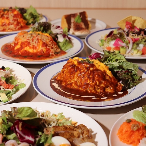 MONIでお食事の際には、自慢のふわふわオムライスをご賞味ください。デミグラス、トマトソース、あいがけの3種類をご用意してお待ちしております。その日の気分に合わせてハンバーグのトッピングも◎