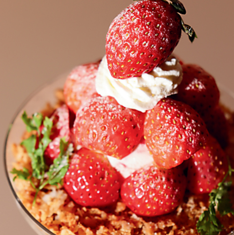 瑞々しい苺とサクサクのパイ生地に濃厚な自家製カスタードクリームを合わせて。ミルフィーユをイメージした華やかな味わいのパフェ。