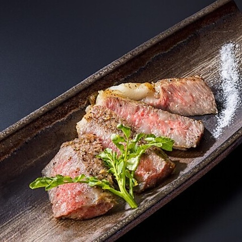 山形牛、米沢牛等をミディアムレアに仕上げます。 お塩と山葵でどうぞ。 国産和牛の種類は仕入れ状況に応じて変わります。
