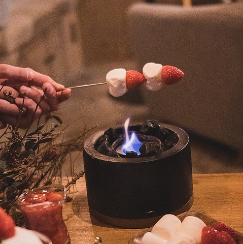 ミニ暖炉で焼く!『焼きマシュマロセット』。シーシャを楽しみながら、火のゆらぎを眺めつつ、ほんのり焦げたマシュマロから甘い香りが立ち広がります。ゆったりとマシュマロを焼く優雅なひとときをお過ごしください。外はカリッと、中はとろける甘さがたまりません!シーシャのお供にどうぞ♪