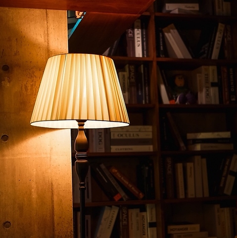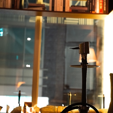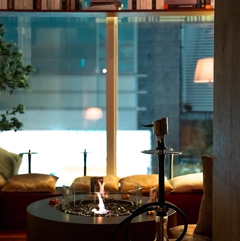 本に囲まれたような店内の意匠は、非日常感を楽しめる大人びた空間を演出。炎が揺らめく店の中の暖炉を眺めながら、思い思いに会話やお食事、シーシャなどをゆっくりとご満喫ください。