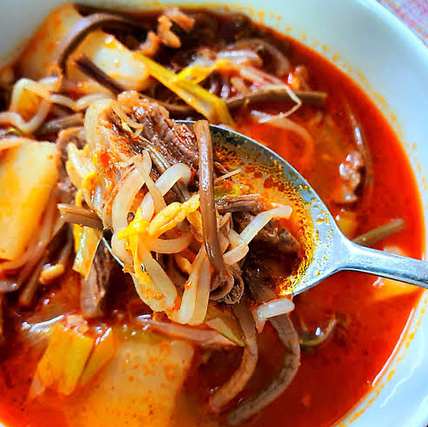 牛骨をじっくり煮込んだ、やさしい味わいの白濁スープ。シンプルだけど、飲めば飲むほど深みが広がります!ご飯やキムチと一緒に、ほっとする時間をどうぞ!
