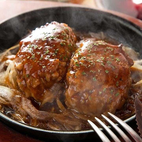 オールビーフのハンバーグは肉汁たっぷり、ジューシーで人気♪ワインなどお酒との相性抜群です◎