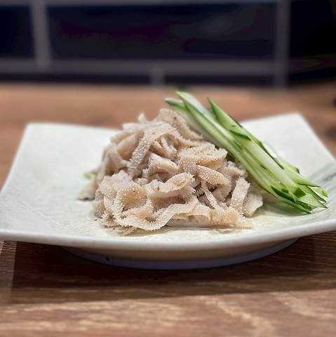 新鮮な白センマイを丁寧に下処理した「白センマイ刺し」。コリッとした食感と淡白ながら旨みのある味わいが特徴で、特製の酢味噌やポン酢でさっぱりと楽しめます。焼肉やホルモンとの相性も抜群で、酒の肴としても人気の一品です。