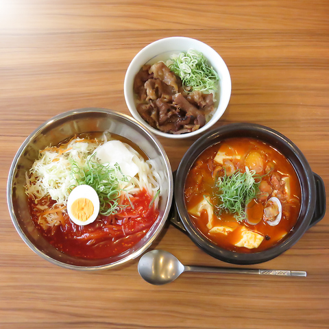 当店の看板メニューをお得に味わえる人気のセット。名物のカルビ丼は香りも抜群。スン豆腐は本場韓国の味!暑い日でも元気をチャージできます。差額でお好みの丼に変更することも可能です。