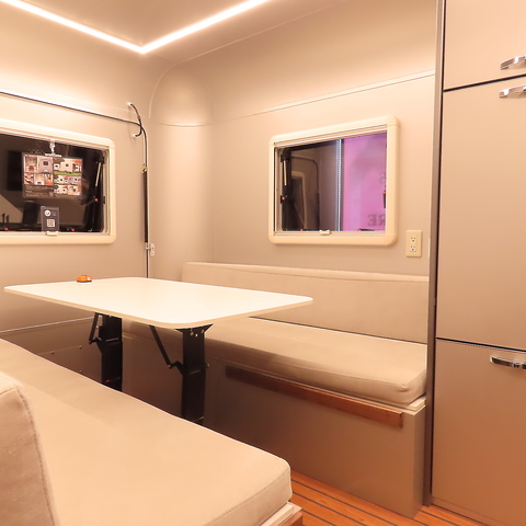 キャンピングトレーラーの中は、最大4名様までご利用可能な半個室席となっております。人気席のため、キャンピングトレーラー席をご希望のお客様は事前にお電話で空き状況をご確認いただきご予約をお願いいたします。