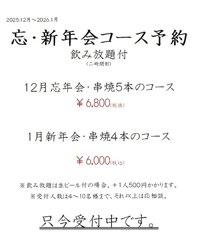 年明け一発目の飲み会にぜひ!牛・鶏・野菜串など入った炭火串焼4本コースで税込6000円♪飲み放題付!