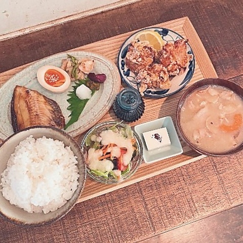 kaguyaの人気のメおかずをひとつの定食にまとめたお腹と心を満たす健康的なごはんです。 <定食の内容> ・国産鶏のからあげ・しまほっけの干物・みやじ豚の豚汁・自家製ドレッシングのサラダ・副菜・ごはん