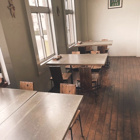横浜の歴史を見守ってきたレトロなビルの2階。大きな窓からは赤レンガ倉庫といった港町ならではの景色を一望できます◎自然光が差し込む明るい店内は、白壁と木の温もりが調和したナチュラルな雰囲気。窓の外に広がる穏やかな景色を眺めながら、日常を忘れてゆったりとした時間を過ごせます♪