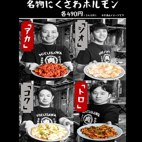 名物にくさわホルモンは肉の部位にあわせた秘伝の味付け。丁寧に下処理した新鮮なホルモンを秘伝ダレが絡んだ深味の【コク】あっさりと上品な【シオ】ガツンと響く濃厚な旨味【アカ】贅沢部位のとろける美味しさ【トロ】の4種ご用意。お酒やご飯にもピッタリの「にくさわホルモン」肉好きの心と胃袋つかむニクいヤツ♪