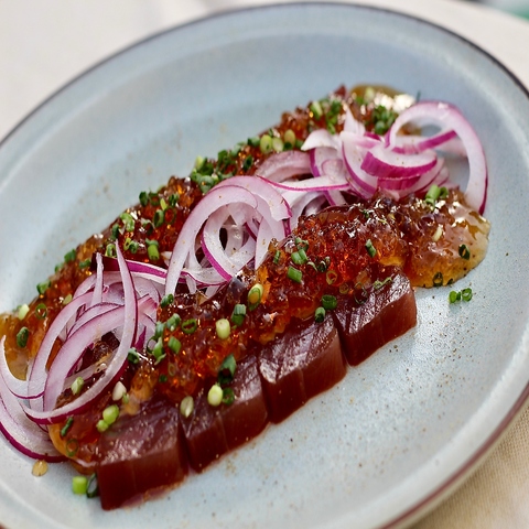 その季節に合った旬の鮮魚を日替わりでご提供いたします。単純なわさびしょうゆでご提供するものに限らず、手作りの薬味やタレを、その鮮魚にピッタリなものでご提供いたします。白ワインはもちろん、赤、ロゼ、オレンジ、泡にも合うお刺身は、当店自慢の商品です。