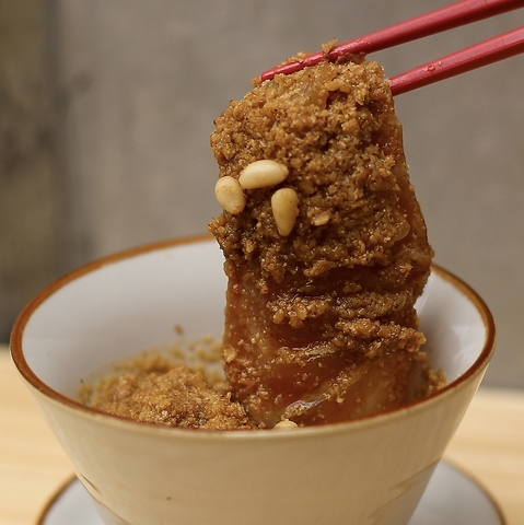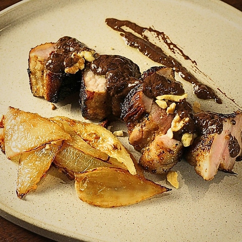 上質な脂の甘みが特徴の、三元白王豚バラ肉を、じっくりと香ばしくソテー。仕上げに合わせるのは、カカオのほろ苦さとナッツの香ばしさを効かせた特製ソース。チョコレートのコクが豚肉の旨みを引き立て、ナッツの食感がアクセントに。甘すぎず、奥行きのある大人の味わい。赤ワインと好相性の、和inならではの創作肉料理