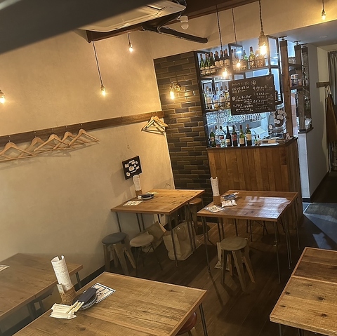 床やテーブルに木材を基調とした店内は、落ち着けるお洒落な内装◎また、天井も高く広々として過ごしやすい空間です。照明や小物などもこだわった店内で、美味しいお酒と料理をご堪能下さい。