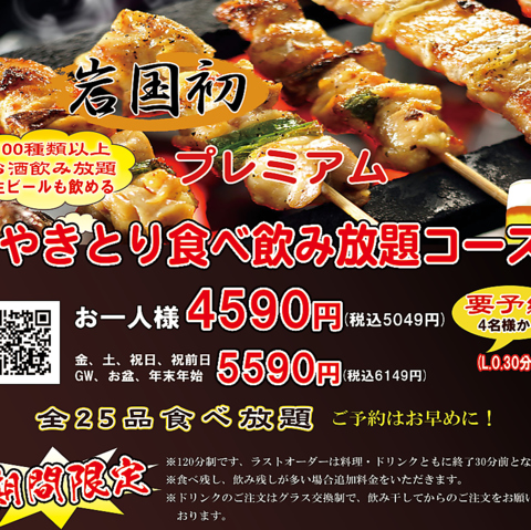 火炎鳥自慢の炭火やきとりや唐揚げ、さばの炙り焼きなど人気の逸品料理に2時間の飲み放題が付いたとってもお得なコースを各種ご用意しております◎お料理10品コースはお一人様4279円(税込)、お料理12品のプレミアムコースはお一人様5489円(税込)となっております!各種ご宴会に是非ご利用ください♪詳細・ご予約はコースページへどうぞ◎