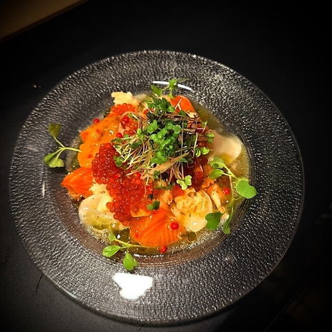 サーモン、イクラ、とびっこ、ウニ、蟹のむき身などちょっと背徳感満載の具材だけで作ったカルパッチョ。