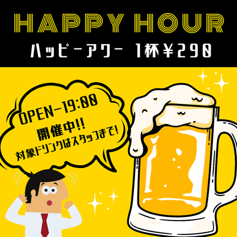 お得なハッピーアワー♪毎日19時まで開催しております。生ビールやハイボール&サワーなどが290円!!