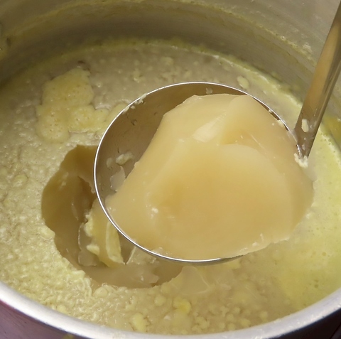 水郷どりのガラを強火で5時間以上かけて煮込んだ鶏がら白湯スープ。写真のコラーゲンの塊をたっぷり使用♪