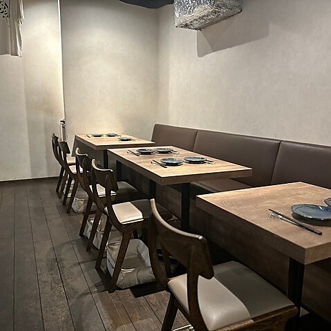 【テーブル席】ゆったりとしたテーブル席は、仲間やご家族との語らいにぴったり。洗練されたインテリアと落ち着いた照明が、居心地の良い空間を演出します。美味しい料理とお酒を囲んで、特別な時間をお楽しみください。