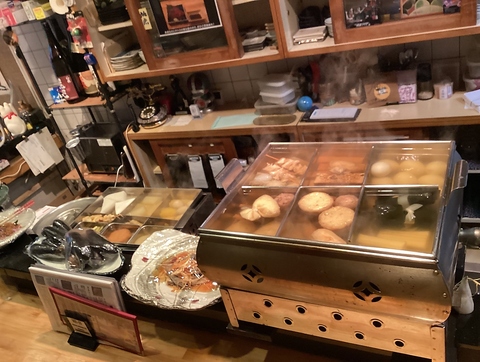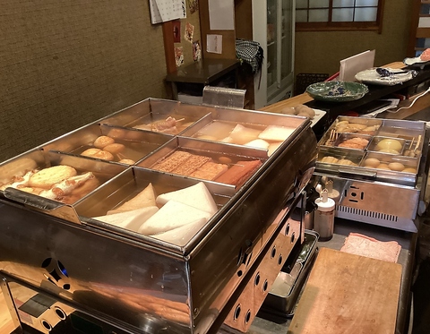 定番おでんから変わり種おでん、自家製練り物おでん、季節の素材のおでん、馬肉串のおでん等30種類のおでんが楽しめます。