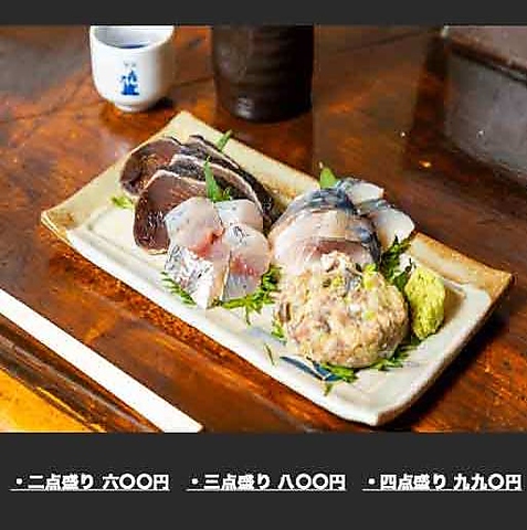二切れから三切れの盛り合わせです。入荷状況により内容が変わります。二点盛、三点盛り、四点盛りからお選びいただけます。