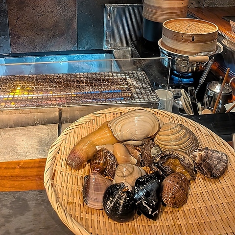 左が貝1人前になります。蒸し貝、焼き貝としてご提供します。また、蒸し野菜、焼き野菜、〆のうどん、等を併せてフルコースでご提供いたします。