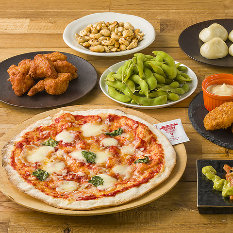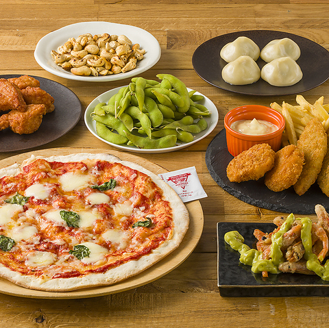 マルゲリータ、枝豆、ザンギ、ミックスシーフードフライ&チップス、ガーリックアボカドシュリンプ、小籠包風肉汁餃子、ローストカシューナッツ