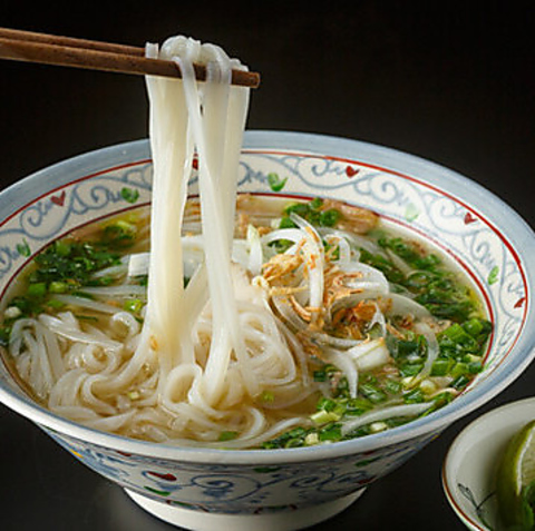 ベトナムでは毎日のように食べられている米からできた平打ち麺。鶏がらや牛骨から作るすっきりしたスープが特徴で、主な具は鶏肉、牛肉、魚介、たっぷりの野菜。お好みで香草をトッピングしたりレモンを絞ります。