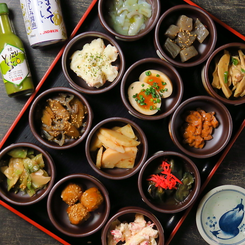 当店のお通しは、その日のおすすめを活かした多彩な一品を、390円(税込)でご提供しております。その種類は非常に豊富で、日ごとに内容が変わるため、訪れるたびに新鮮な驚きと楽しみを感じていただけます。毎回違った味わいで、お食事のスタートを彩る心づくしの一皿。当店ならではの季節感や旬の味覚をお楽しみください。
