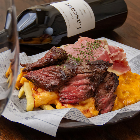 肉の旨味と生ハムの塩気が絶妙にマッチ!ボリューム満点の「ハラミととろける卵と生ハムのポテトフライ」