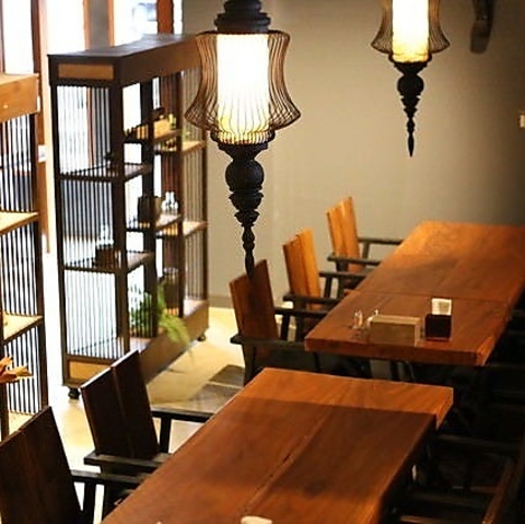 【アジアンリゾート風で非日常】木目調の店内やエスニックなランプが、まるでアジアンリゾートのような雰囲気を作る店内。ソファー席やグループでご利用できるテーブル席をそれぞれご用意しております。また当店は、壁や扉でしっかりと仕切られた個室席完備ですので、周りのお客様を気にせずお食事を楽しむことができます。