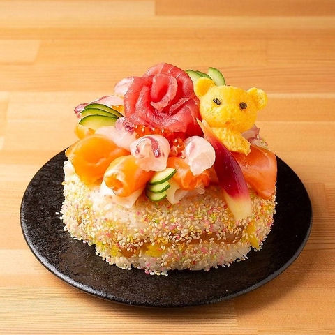旬の鮮魚で作るオリジナル寿司ケーキは、お祝いの席に最適!華やかで可愛らしい見た目で、甘いものが苦手な方におすすめです♪お誕生日や記念日に、ぜひご注文ください。また、通常デザートでのサプライズプレートのご用意や、他店様で購入されたケーキも持ち込みいただけます。事前にご相談ください。