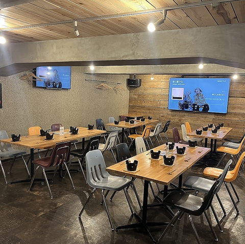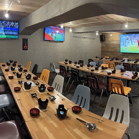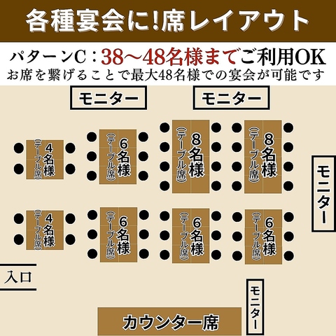 【パターンC】38~48名様までご利用OK!テーブル席を繋げることで、最大48名様までご利用いただけます。大規模宴会も当店にお任せください。また、モニターを計4つ完備しておりますので、スポーツ観戦や思い出の映像を流す同窓会など、多様なニーズに合わせた演出が可能です。