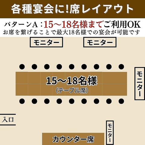 【パターンA】15~18名様までご利用OK!テーブル席を繋げることで、最大18名様までご利用いただけます。広々空間でのご宴会をお楽しみください。また、モニターを計4つ完備しておりますので、スポーツ観戦や思い出の映像を流す同窓会など、多様なニーズに合わせた演出が可能です。