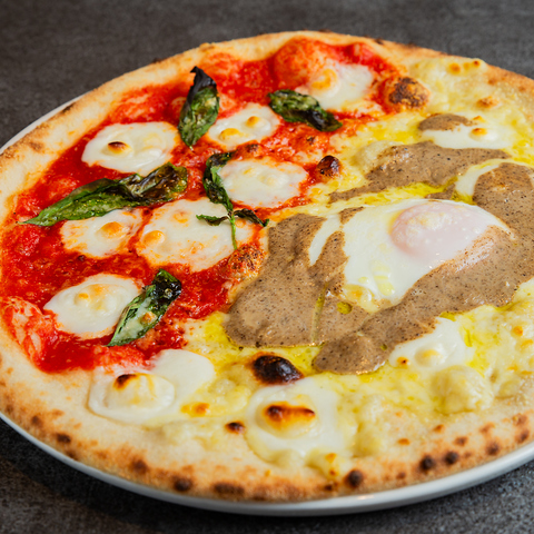 とろ~り卵の「トリュフとポルチーニ茸のビスマルク風ピザ」は間違いない美味しさ!人気NO.1のピッツァ!